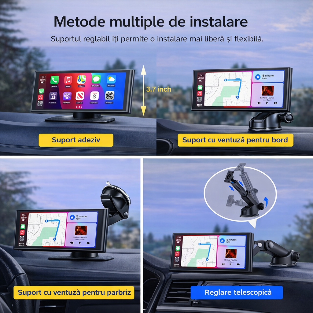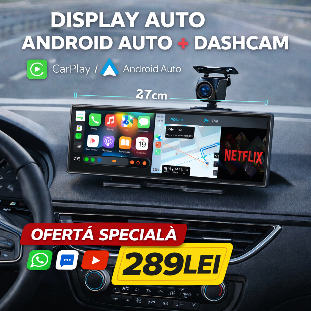 CarPlay și Android Auto WIRELESS, cu dublă cameră de bord (Dash Cam) încorporată, compatibil cu orice vehicul.